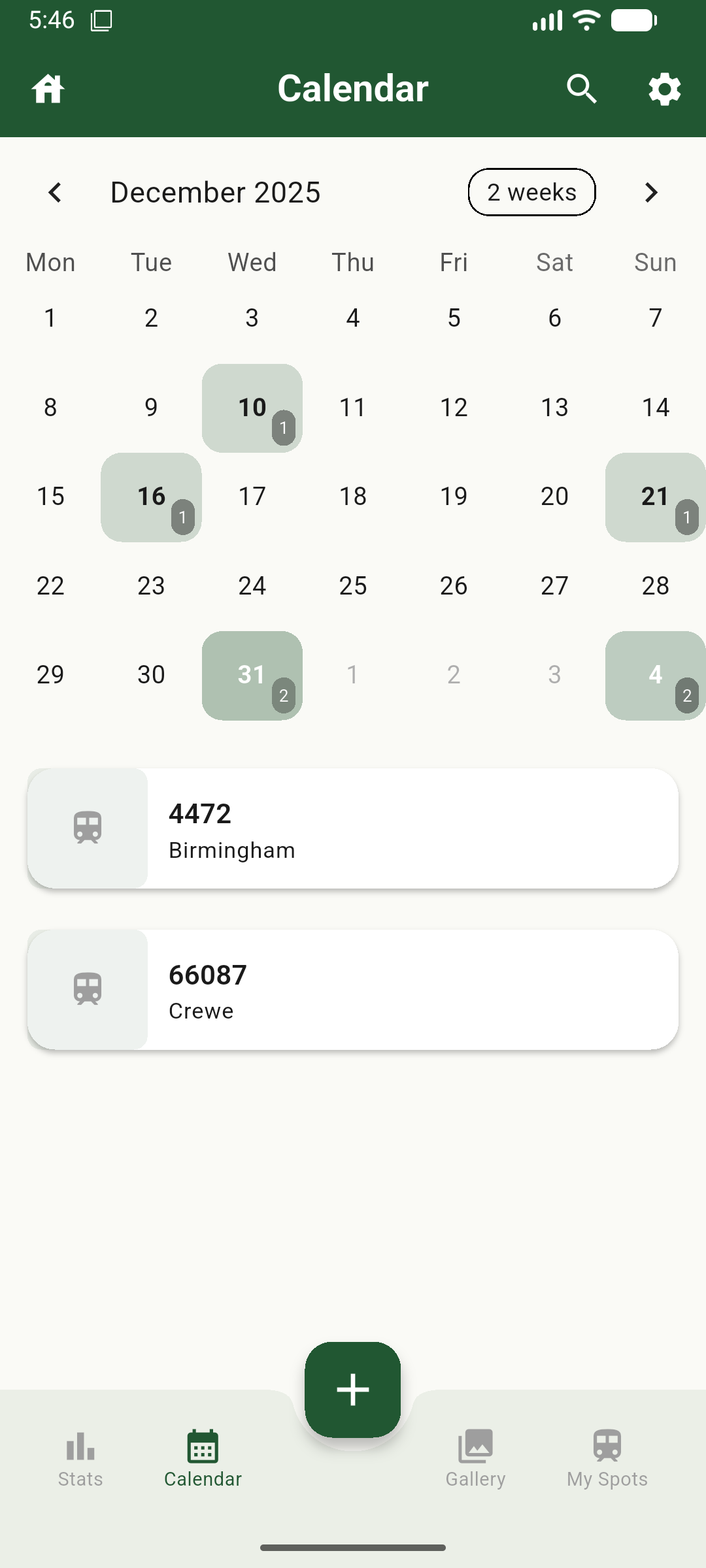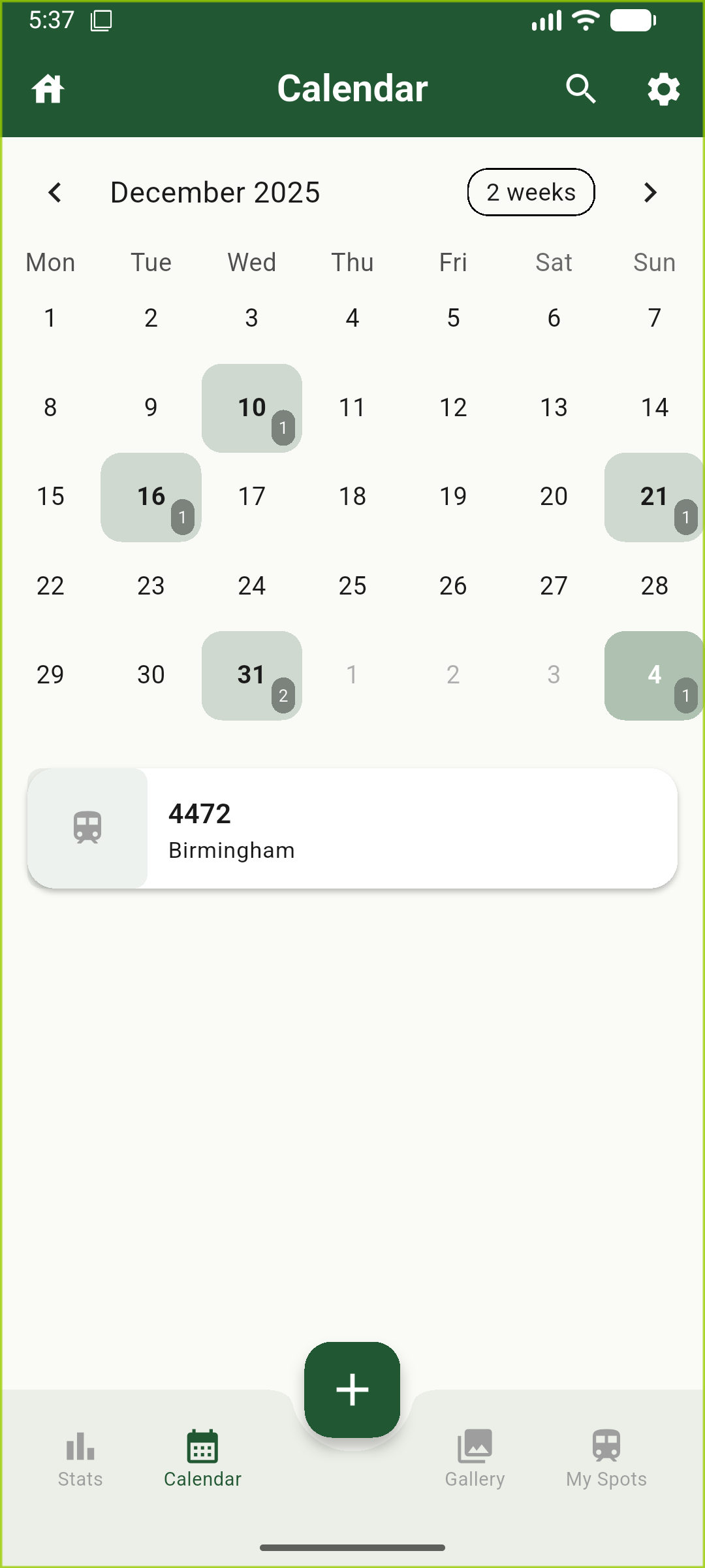 The calendar screen shows you a month by month view of your spots laid out in a monthly calendar format, each date that contains a spot has a numerical identifier which shows how many spots were recorded on that day