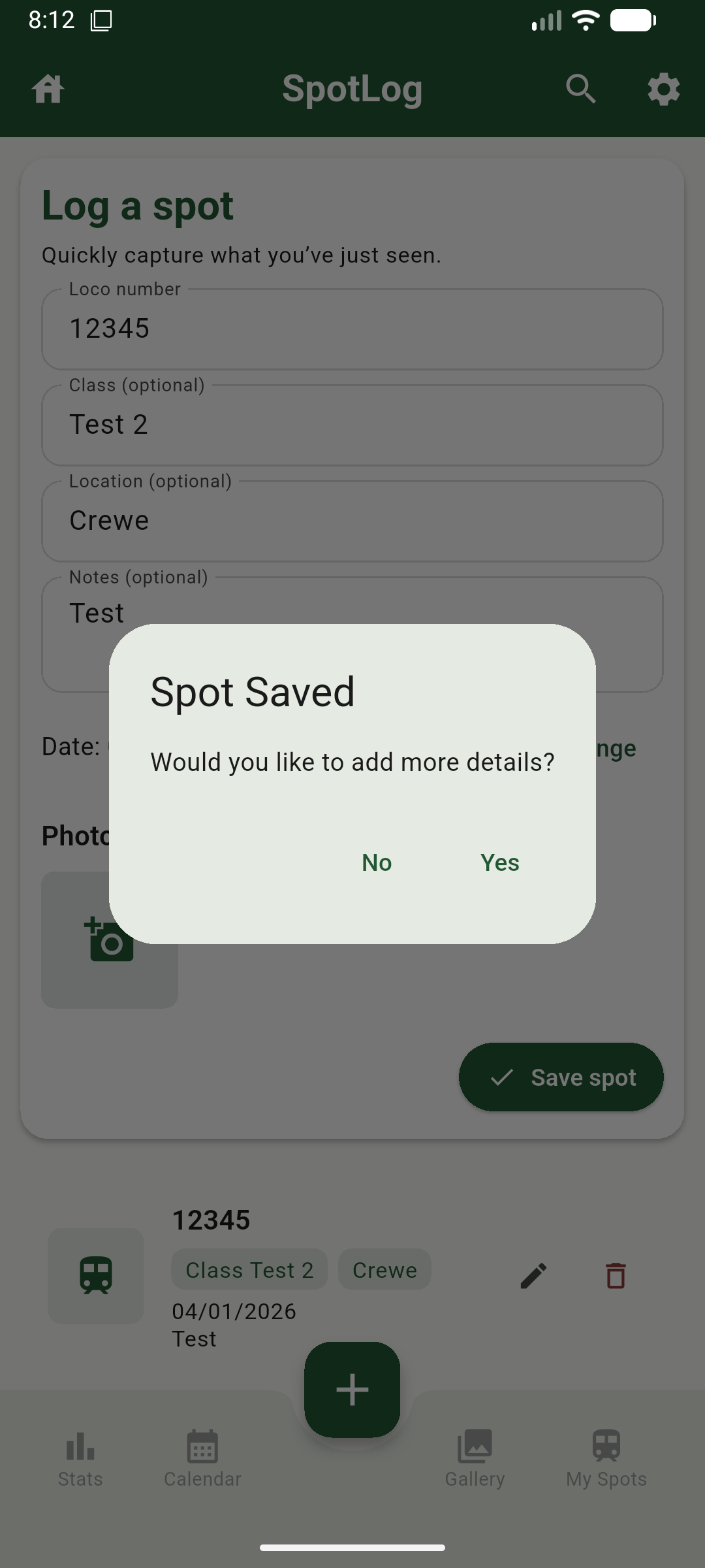 Once a spot has been recorded using the quick spot, SpotLog will ask you if you would like to record more detailed information for this spot